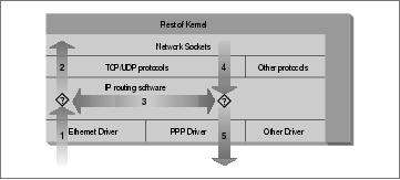 In our diagram, the flow 1→3→5 represents our machine routing data between a host on our Ethernet network to a host reachable via our PPP link. The flows 1→2 and 4→5 represent the data input and output flows of a network program running on our local host. The flow 4→3→2 would represent data flow via a loopback connection. Naturally data flows both into and out of network devices. The question marks on the diagram represent the points where the IP layer makes routing decisions.