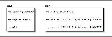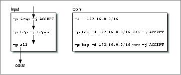 Our example creates user-defined chains for each of the ssh and www services in each connection direction. The chain called wwwout is where we place rules for hosts that are allowed to make outgoing World Wide Web connections, and sshin is where we define rules for hosts to which we want to allow incoming ssh connections. We've assumed that we have a requirement to allow and deny individual hosts on our network the ability to make or receive ssh and www connections. The simplication occurs because the user-defined chains allow us to neatly group the rules for the host incoming and outgoing permissions rather than muddling them all together. The improvement in efficiency occurs because for any particular datagram, we have reduced the average number of tests required before a target is found. The efficiency gain increases as we add more hosts. If we hadn't used user-defined chains, we'd potentially have to search the whole list of rules to determine what action to take with each and every datagram received. Even if we assume that each of the rules in our list matches an equal proportion of the total number of datagrams processed, we'd still be searching half the list on average. User-defined chains allow us to avoid testing large numbers of rules if the datagram being tested doesn't match the simple rule in the built-in chain that jumps to them.