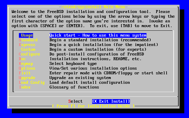 Answer Y to save the parameters to memory (it will be saved to disk if you finish the install) and the probing will start. After displaying the probe results in white on black text sysinstall will start and display its main menu (Figure 2-5).