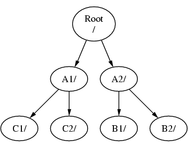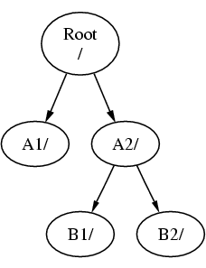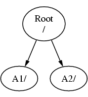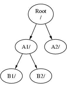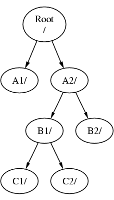 Call A the root filesystem. If you used the ls command to view the contents of this directory you would see two subdirectories, A1 and A2. The directory tree looks like this: