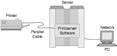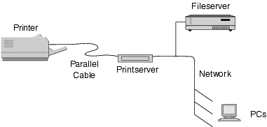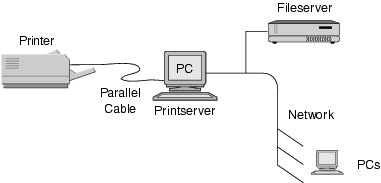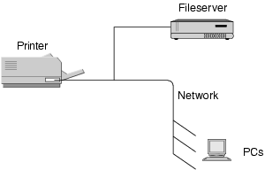 The printer can be physically cabled to the PC running the Network OS. Print jobs are submitted by clients to the printserver software on the fileserver, which sends them down the parallel or serial cable to the printer. The printer must be physically close to the fileserver. This kind of printserving is popular in smaller workgroup networks, in smaller offices.